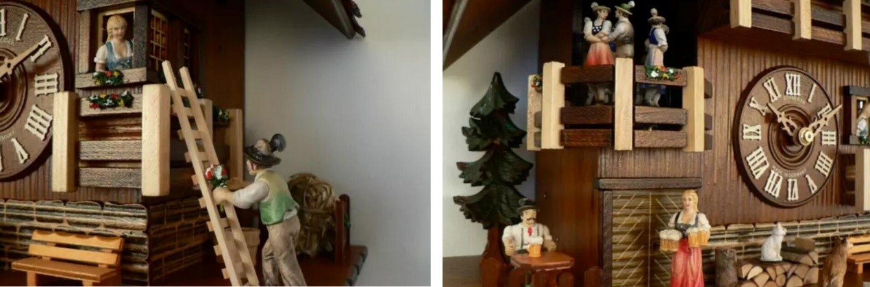 这款型号:8TMT 1430/9的布谷鸟钟,表现了一位求婚者正给他爱的人带来一束花以及客栈掌柜、舞蹈演员、一只狗和一只猫的场景。在维多利亚时代有个传统,盛行送花表达各种象征意义,那时求婚者在选择用什么花以及在什么地方用花来接近女士时必须非常小心。通常小型花束,叫做吐丝慕丝,是用来安静地表达深厚隐秘的感情。如果第一束花被接受了,就可以继续追求女士。当双方的关系改变时,花色和花的种类也要改变。不仅仅花色含义深远,玫瑰的类型、组合方式、花蕾的状态都可以向接受者表达不同的感情深度。