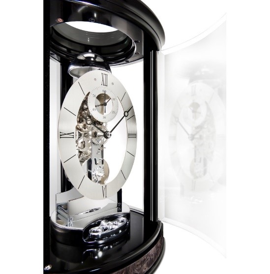 缎面黑色钢琴漆钟身,搭配时尚的灰色纹路饰面,非常具有商务气息。镀银时刻圈下方是精巧的上发条钥匙抽屉,每一处的细节都相当完美。开放式钟盘,可以直接透视到内部的机芯,对每个机械时钟爱好者来说,这真的是一种直接的诱惑!极简风格的时刻显示设计,独立秒针显示盘,展示着不俗的气质。来自肯宁家的精密机芯,TF系列机芯,半小时打点一次,正点报时,有如珠宝般精致,容纳于小巧的钟身之中,非能工巧匠而不成。