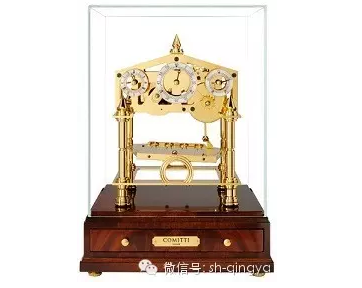 康格里夫走珠钟(见图2)是以其发明者威廉·康格里夫爵士(Sir William Congreve)命名,是时钟收藏者们的最爱。原创时钟于1808年被赠送给当时的威尔士亲王,并成为白金汉宫中皇家收藏的一部分。 手工制作的均力圆锥动力输出机芯有镀金和镀铑可供选择。
